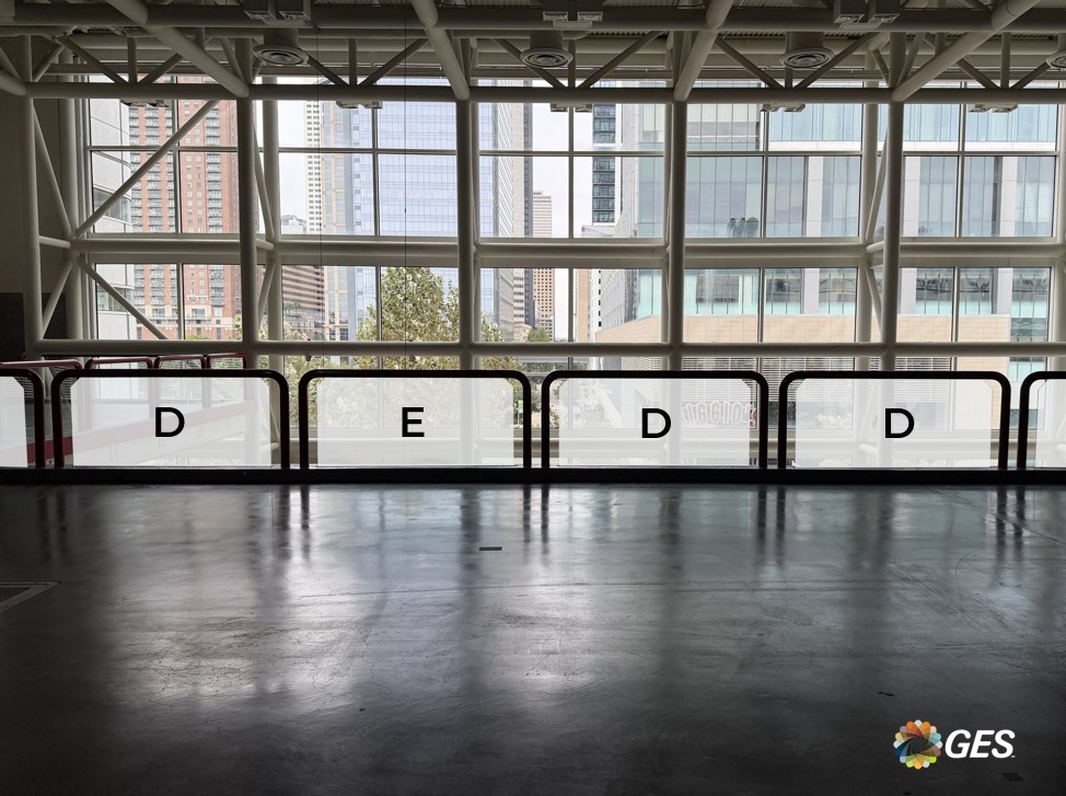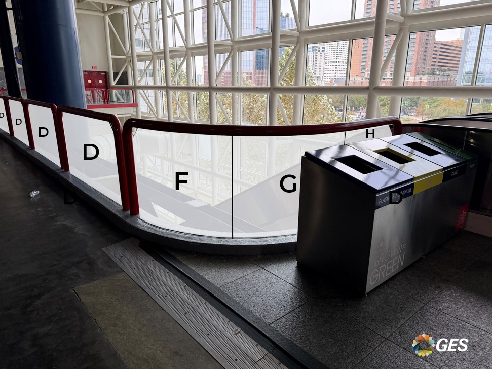 NOTE: top corners of glass are on an angle as shown and will be trimmed onsite during installation. Order of sections from left to right = A, B, A, A, C, C, D, E, D, D, D, D, D, D, F, G, H.