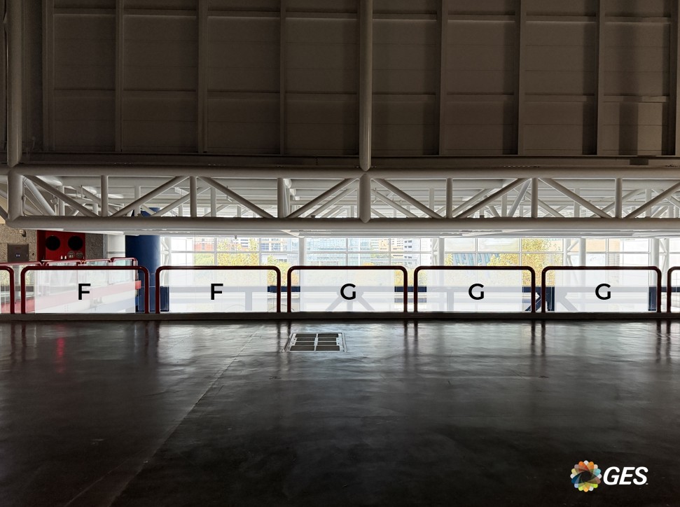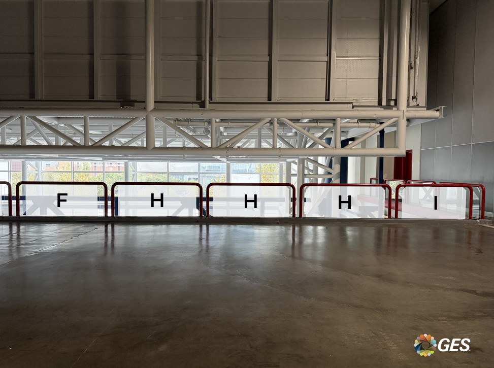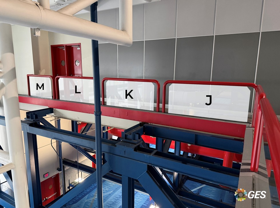 NOTE: top corners of glass are on an angle as shown and will be trimmed onsite during installation. Order of sections from left to right = A, B, B, B, C, D, E, F, F, G, G, G, F, H, H, H, I, J, K, L, M.