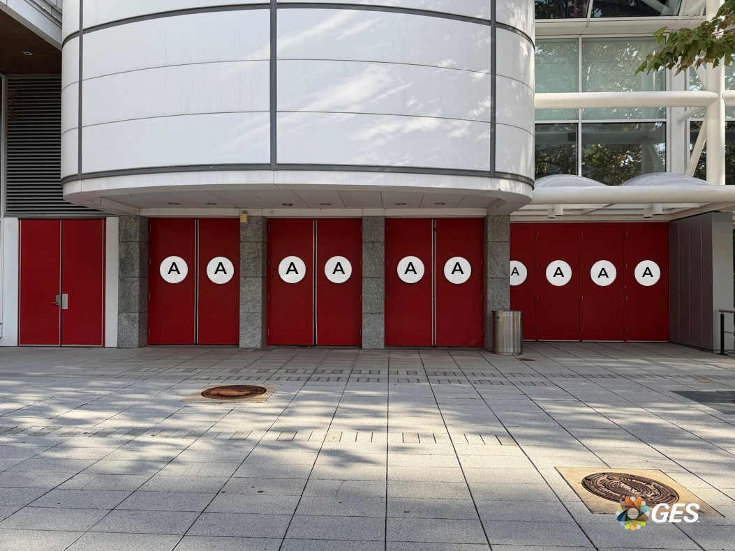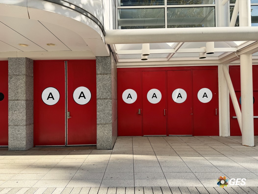 A = 22.5” diameter (qty 2) B = 11” diameter (qty 4) Single sided graphic Perforated window cling Applied to facility windows Located on the outside of the entrance doors to the Hall A lobby NOTE: only doors with graphic A provide access to the Hall A lobby