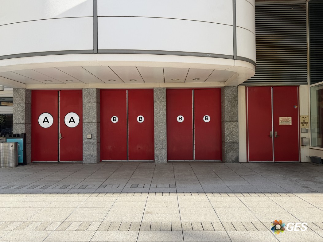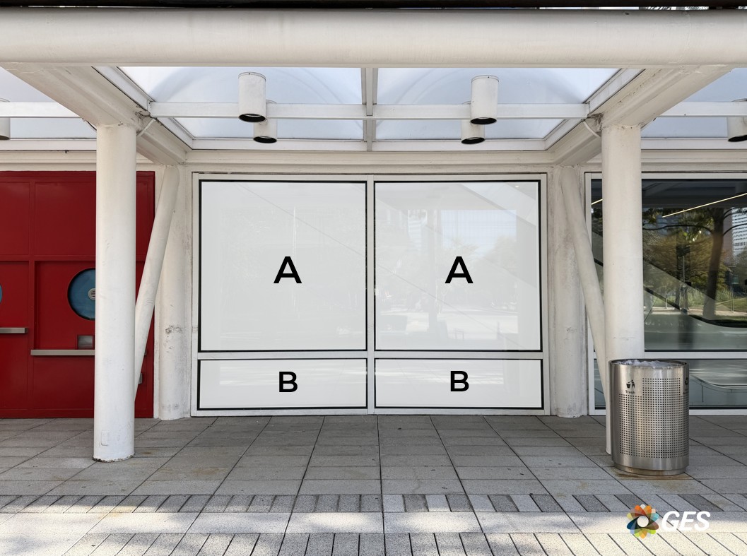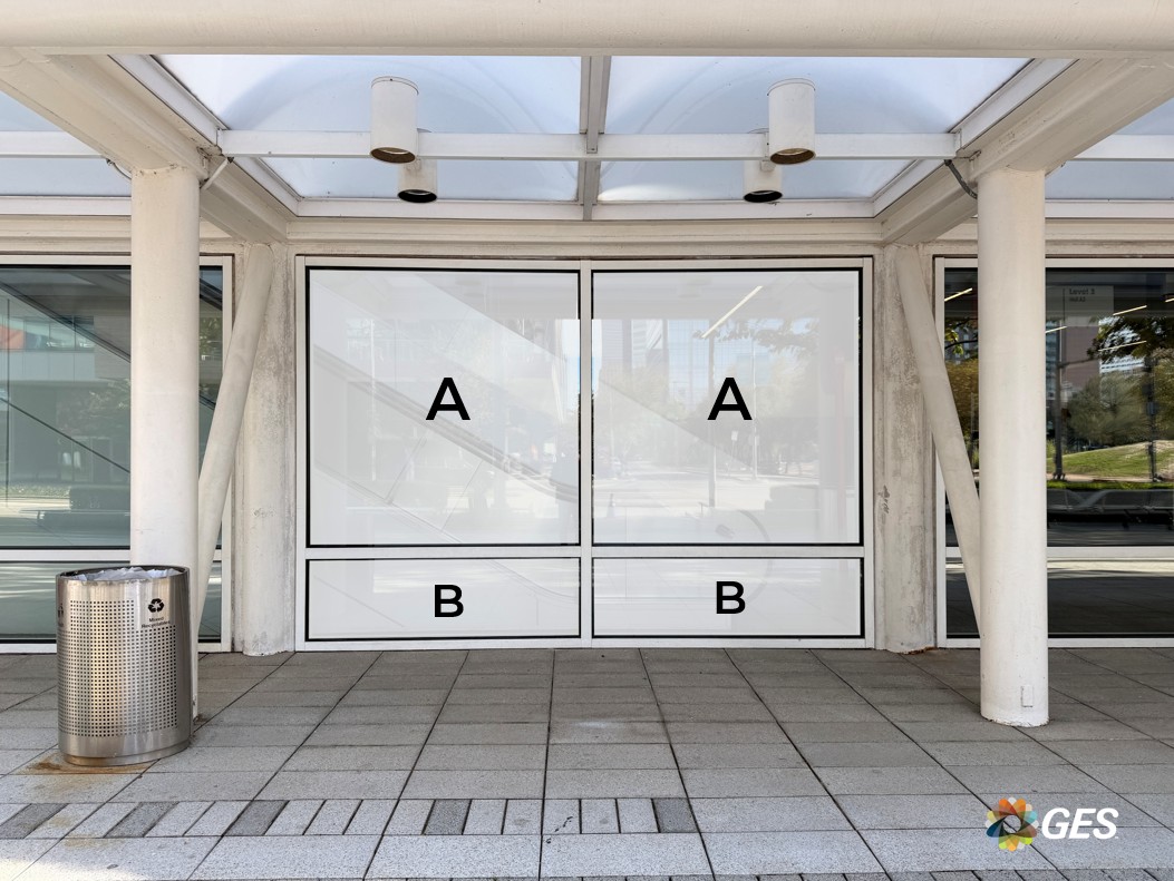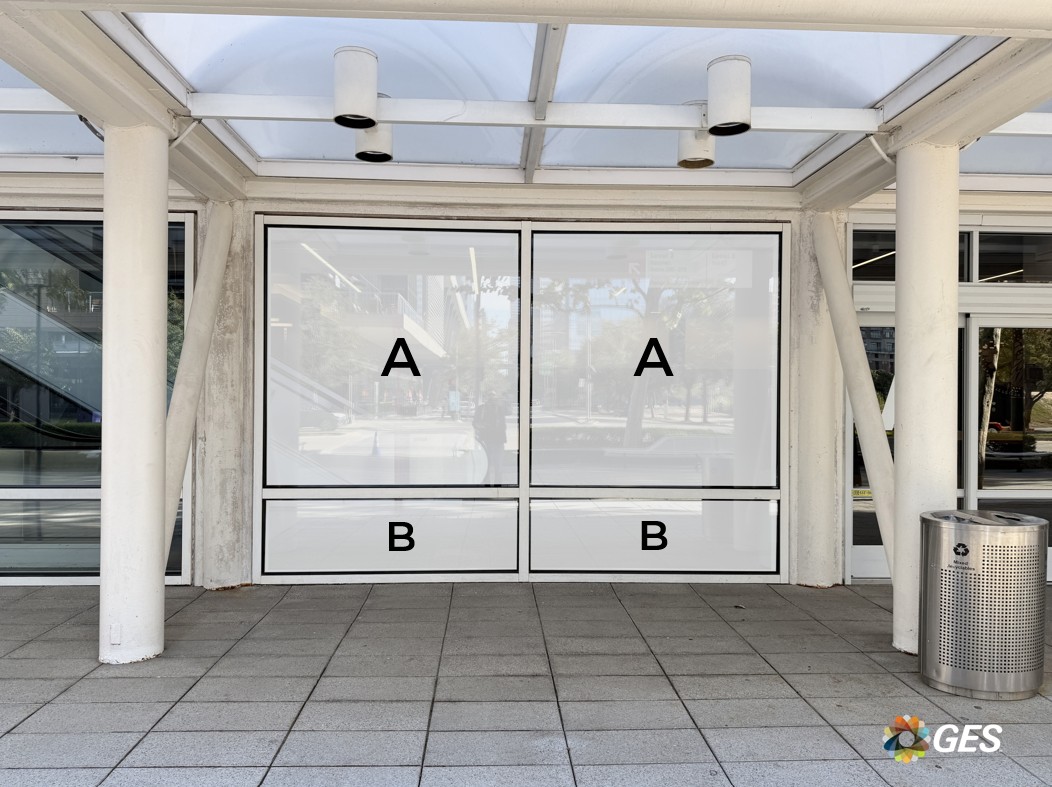 A = 75.25” wide x 77” high (qty 2) B = 75.25” wide x 22.75” high (qty 2) Single sided graphic Perforated window cling Applied to facility windows Located inside the entrance doors in the Hall A lobby at the bottom of the escalators up to level two Add to cart