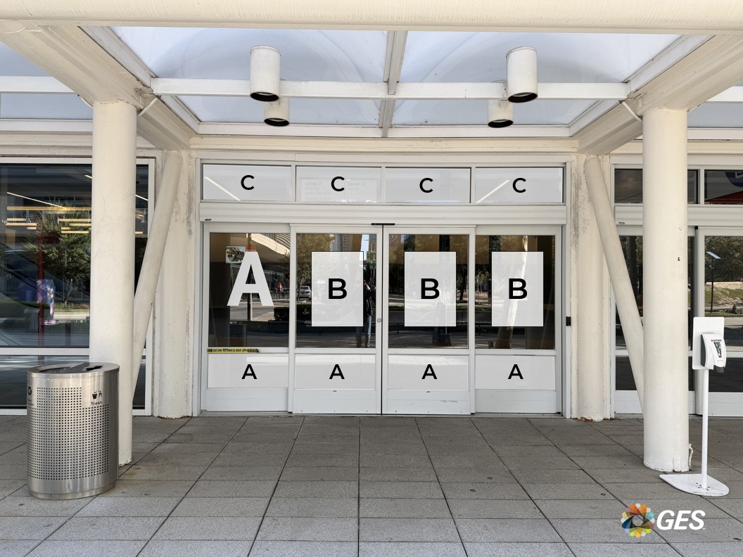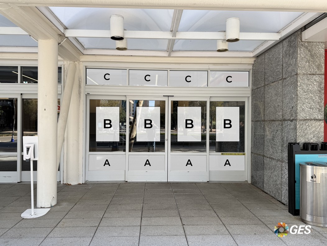 A = 35.25” wide x 14.75” high (qty 4) B = 24” wide x 36” high (qty 3, recommended size) C = 39” wide x 17.5” high (qty 4) Single sided graphic Perforated window cling Applied to facility windows and doors Located outside on the entry doors to the Hall A lobby Full size of top section of glass is 35.25” wide x 50.25” high.