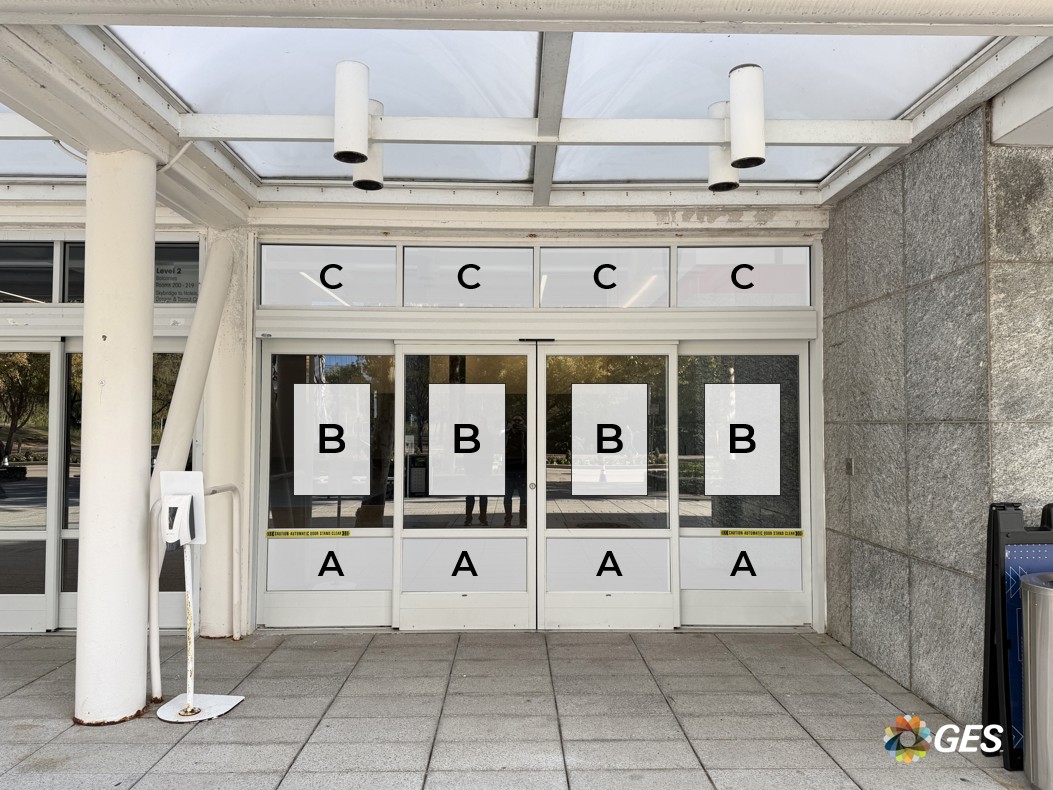 A = 35.25” wide x 14.75” high (qty 4) B = 24” wide x 36” high (qty 4, recommended size) C = 39” wide x 17.5” high (qty 4) Single sided graphic Perforated window cling Applied to facility windows and doors Located outside on the entry doors to the Hall B lobby Full size of top section of door is 35.25” wide x 50.25” high.