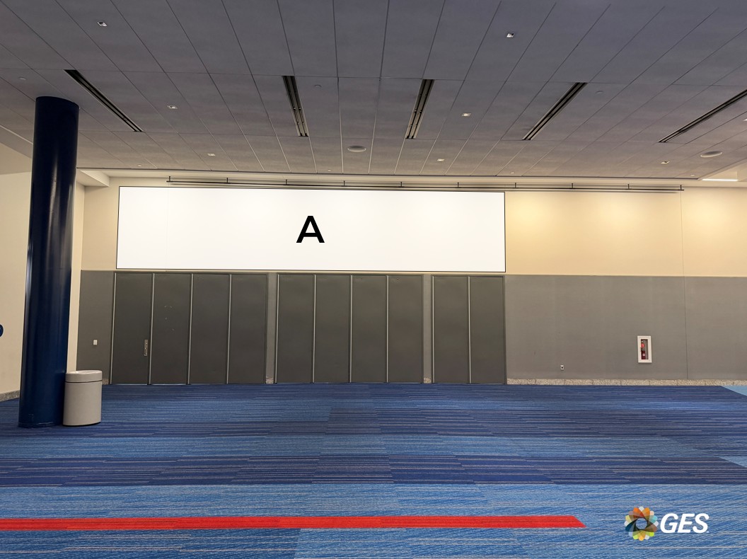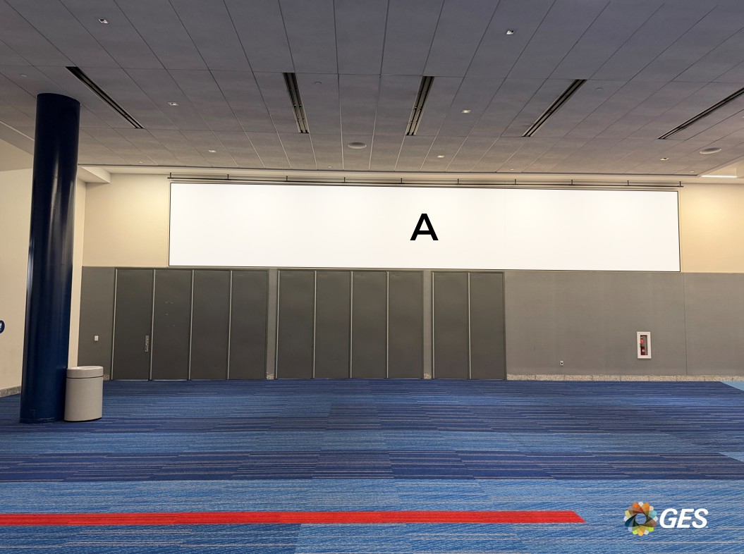 A = 44’ wide x 6’ high Single sided banner 4” pockets top and bottom Mounted on interior hang points Located on level one above the entrance doors to Hall A Add to cart