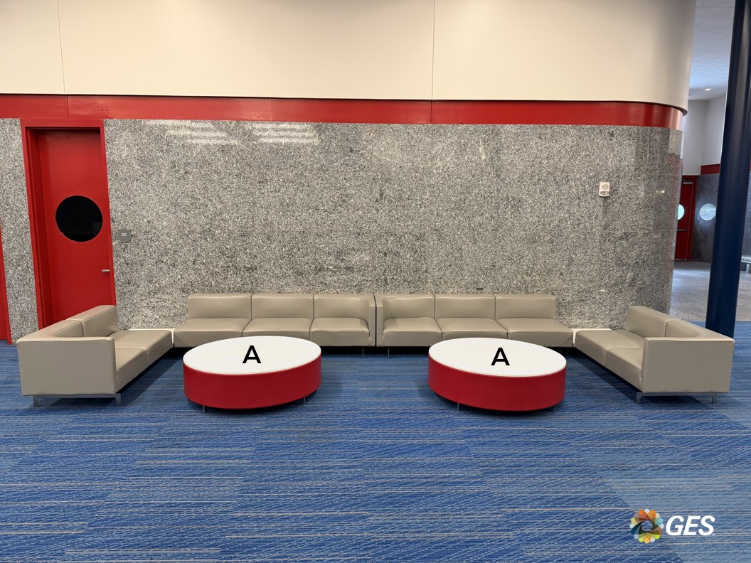 A = 51.125” Diameter (qty 2) Single sided graphic Phototex / PSV Applied to top of facility ottomans Located on level one in the Hall A lobby NOTE: confirm with your event manager that these are in this location and available