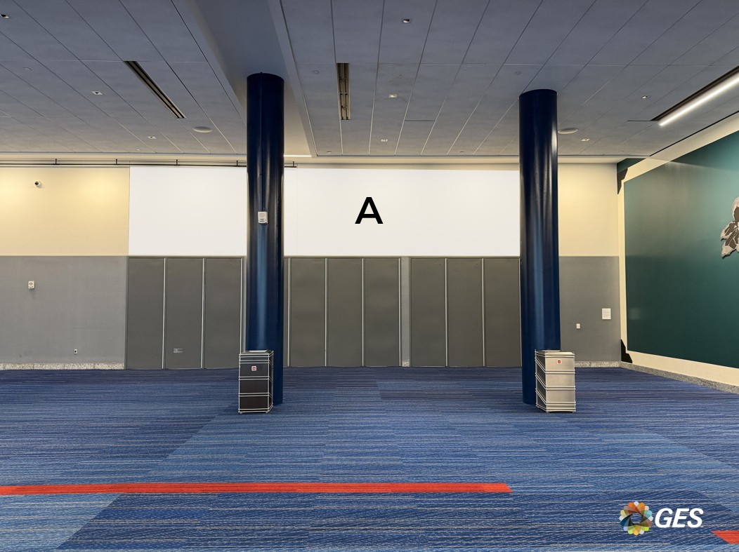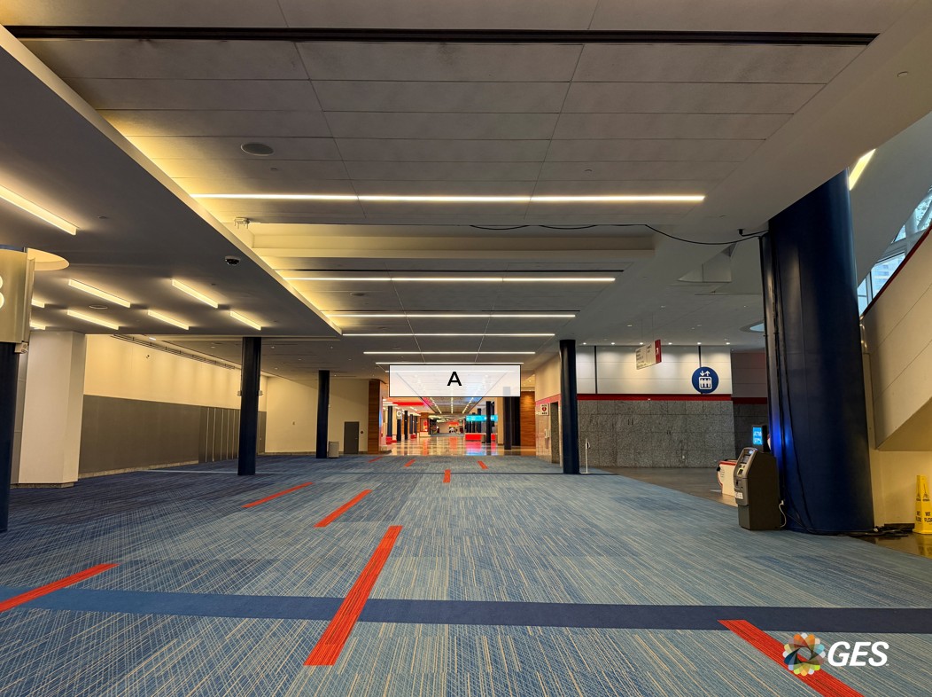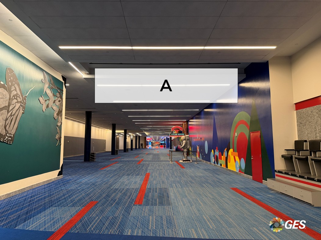 A = 14’ wide x 5’ high (recommended size) Double-sided banner 4” pockets top and bottom Mounted on interior hang points Located on level one in the Hall B lobby NOTE: Maximum width is 20’. Recommended size of 14’ wide due to visibility behind Saltgrass Steak House sign as shown.