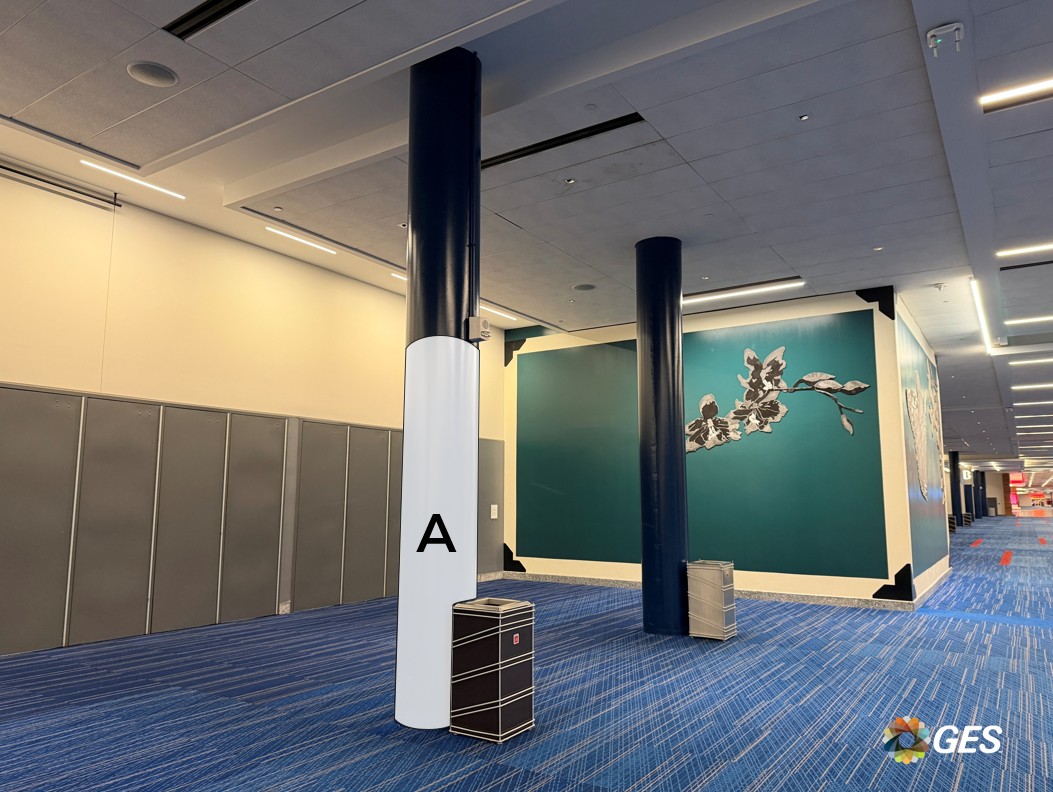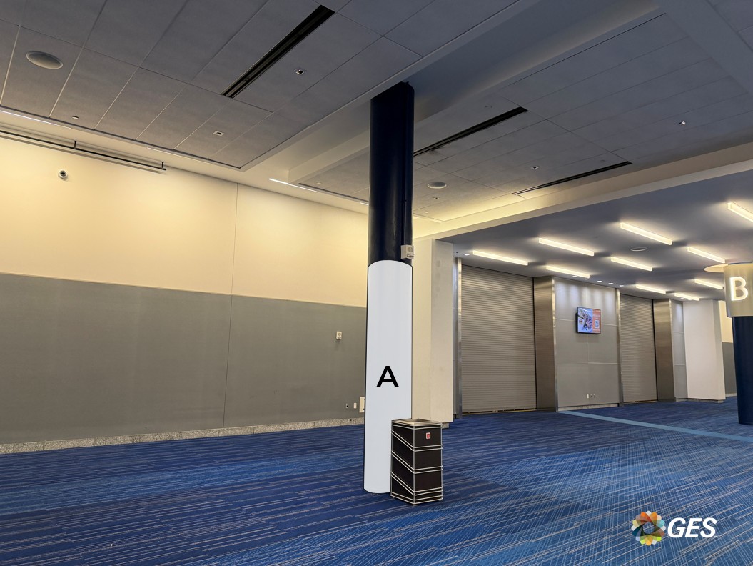 A = 76” wide x 197” high Single sided graphic Fabric banner with zipper closure Wrapped around facility column Located on level one across from the entrance to Hall B NOTE: To use vinyl banner instead of fabric, add 2” for overlap and Velcro closure.