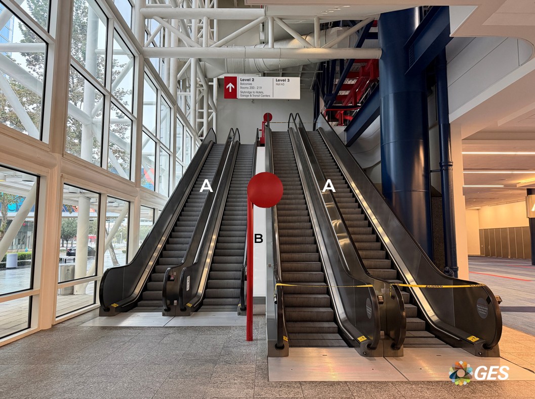 A = 690” long x 11.25” wide (qty 2, left and right) B = 604” long x 18” wide (qty 1, center) Single-sided vinyl banner No pockets Placed between escalators Located on level one in the Hall A lobby up to level two Add to cart