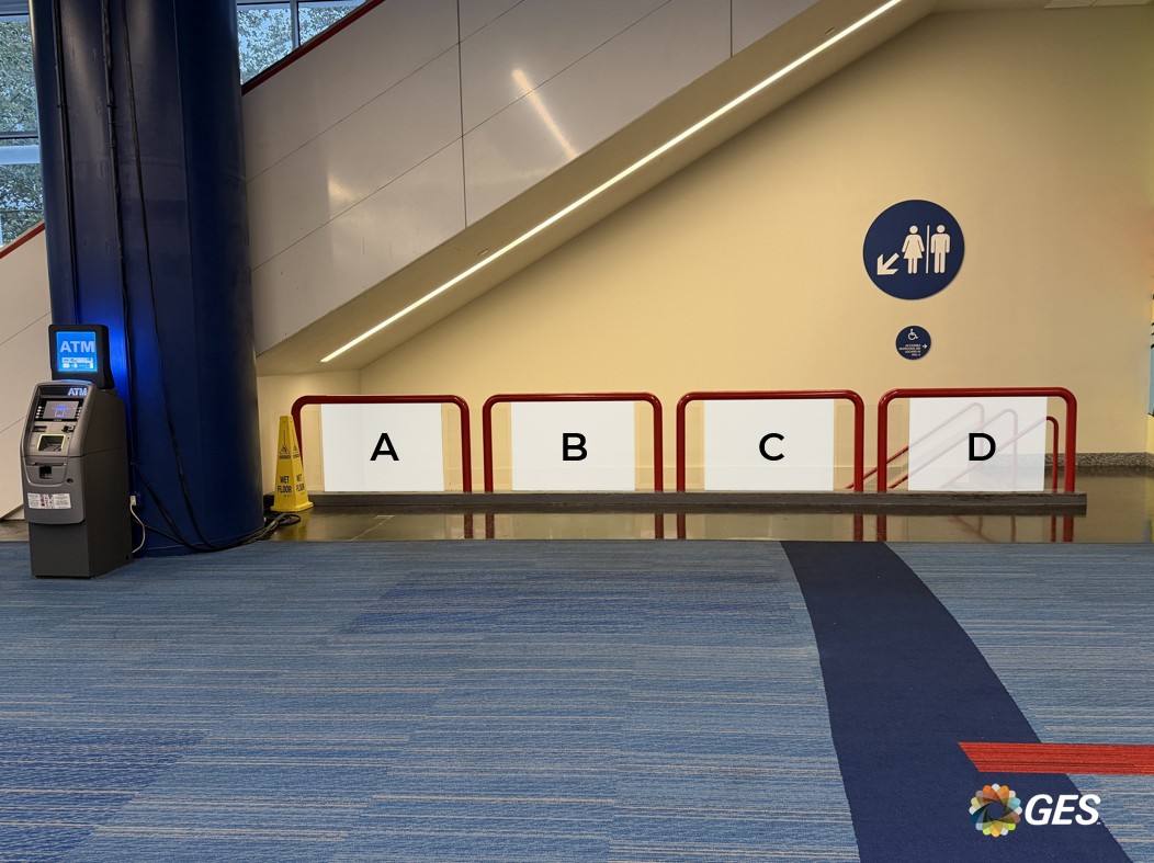 A = 47.5” wide x 35” wide (qty 1) B = 48.25” wide x 35” high (qty 1) C = 48.5” wide x 35” high (qty 1) D = 48.375” wide x 35” high (qty 1) Single sided graphic Phototex / window cling Applied to glass below railing Located on level one in the Hall B lobby Add to cart