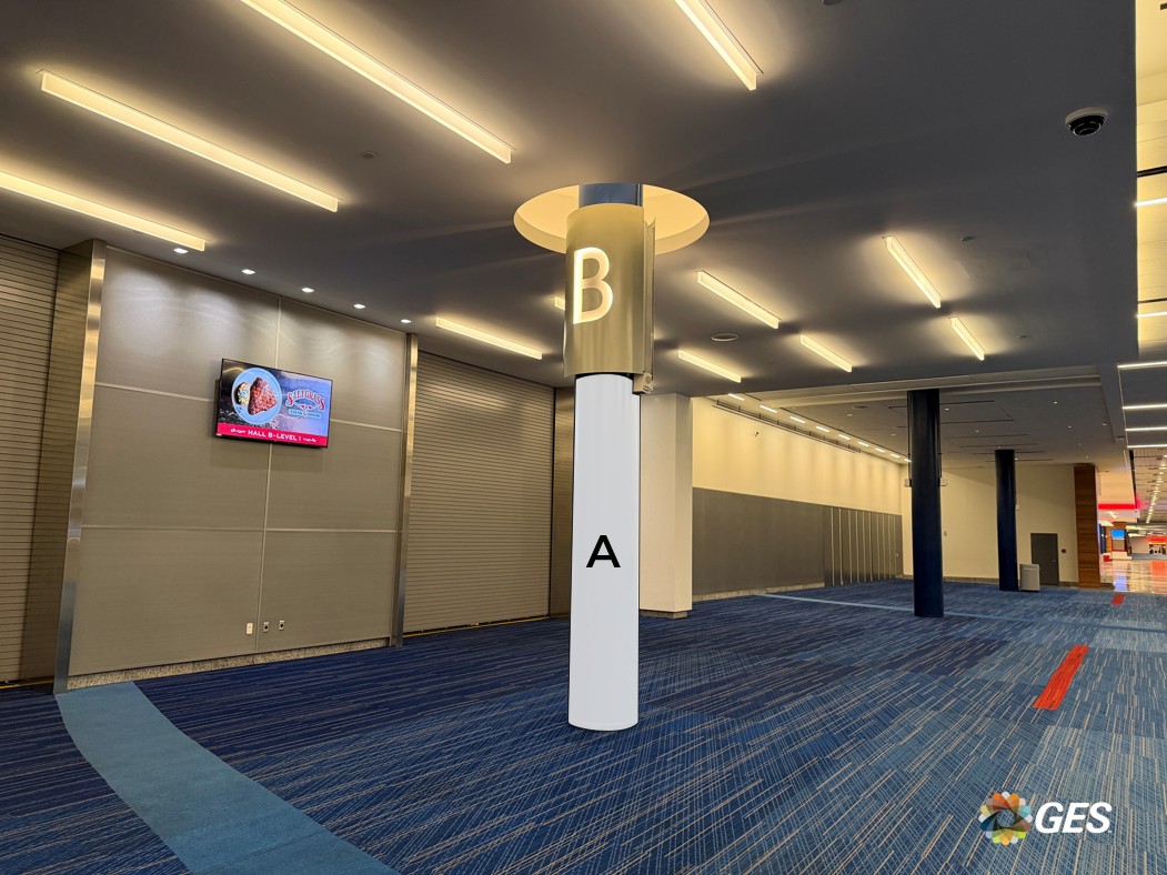 A = 24” Diameter (qty 2) Single sided graphic Phototex / PSV Applied to facility structure Located on level one in front of escalator in the Hall A lobby up to level 2 Add to cart