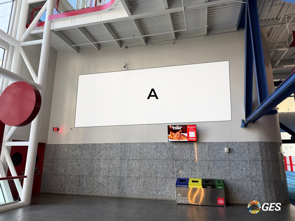 A = 15’ wide x 14’ high Single sided banner 4” pockets top and bottom Mounted on interior hang points Located on level two at the bottom of the escalators near Registration D up to level three Add to cart