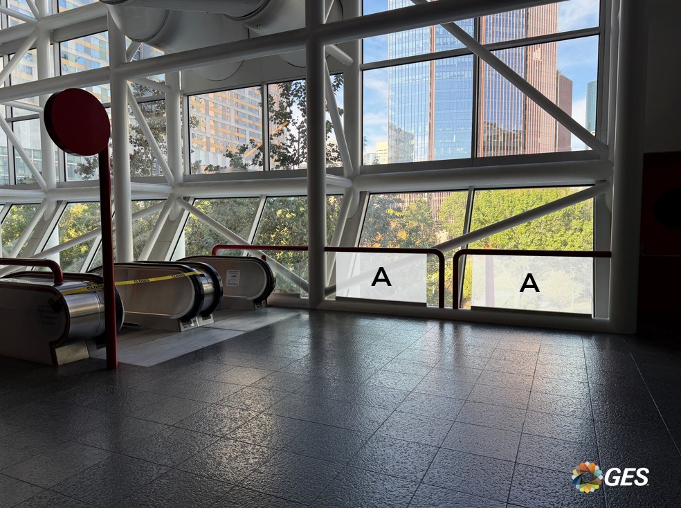 A = 54.5” wide x 40.5” high (3 rows per section, 28 sections per side) Single sided graphic Perforated window cling Applied to windows Located on level 2 in the skybridge to the Hilton America’s - Houston NOTE: some sections are obstructed by beams as shown in the 3rd image. (21) unobstructed sections per side.
