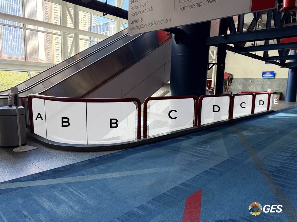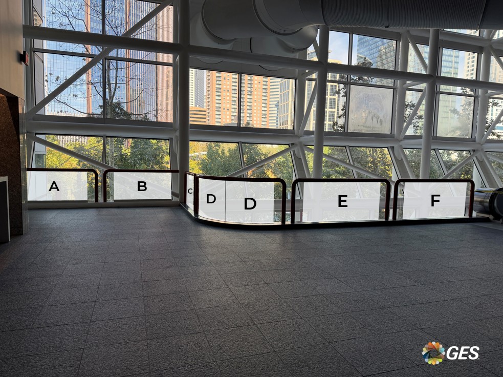 A = 61.75” wide x 34.75” high (qty 1) B = 62” wide x 34.75” high (qty 1) C = 52.25” wide x 34.75” high (qty 1) D = 42” wide x 34.75” high (qty 2) E = 77.5” wide x 34.75” high (qty 1) F = 77.25” wide x 34.75” high (qty 1) Single sided graphic Phototex / window cling Applied to glass below railing Located on level two in front of escalator near Registration D up to level three NOTE: Order of sections from left to right = A, B, C, D, D, E, F.