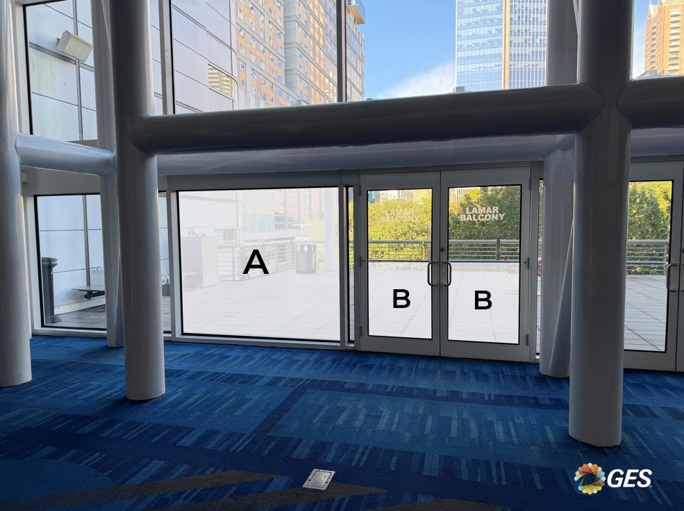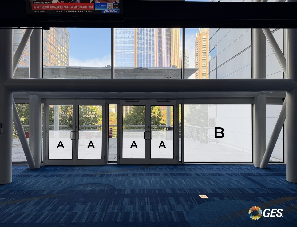 A = 87.75” wide x 73.25” high (qty 1) B = 28.375” wide x 33” (qty 2) Single sided graphic Perforated window cling Applied to facility windows and doors Located on level at the entrance to the Lamar Balcony NOTE: full size of door glass is 66.375” high