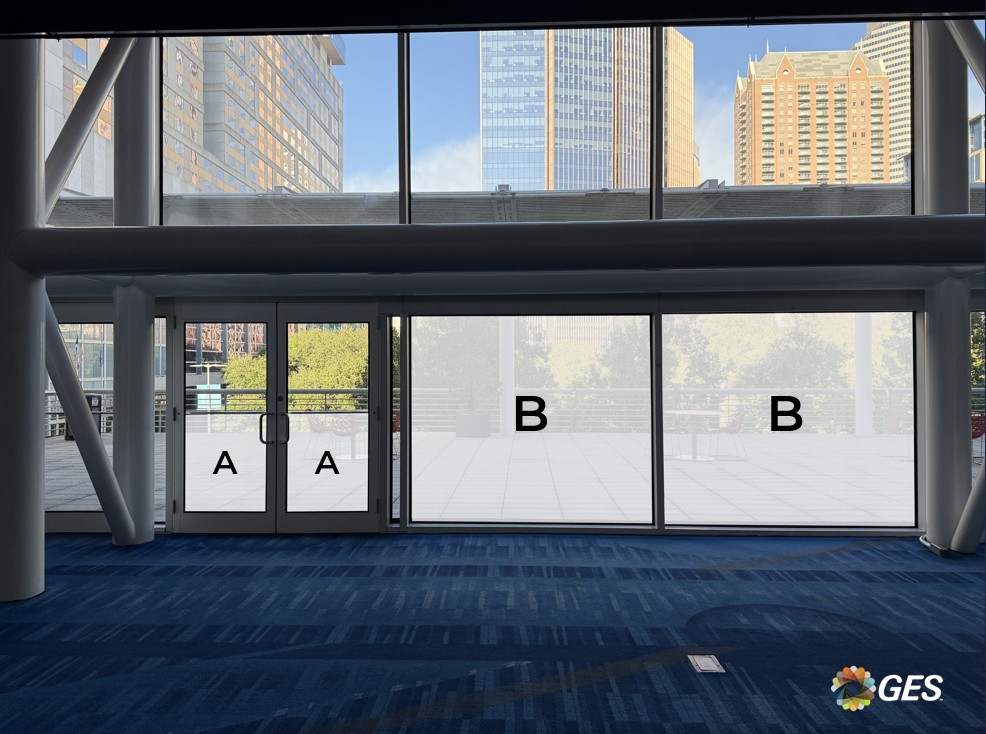 A = 24” wide x 36” high (qty 4, recommended size) Single sided graphic Perforated window cling Applied to windows and doors Located on level 2 on the entry doors of the skybridge leading to the Hilton America’s - Houston NOTE: Check with your facility event manager if this opportunity is available for your event. Full glass size is 38.5” wide x 75” high. All doors slide to open.