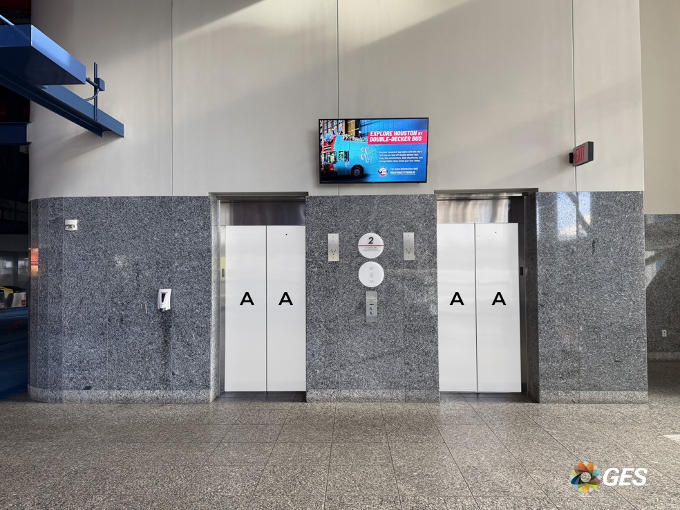 A = 21” wide x 83.5” high (qty 4) Single-sided graphic Phototex / PSV Applied to elevator doors Located on level 2 near the skybridge leading to the Hilton America’s - Houston Add to cart