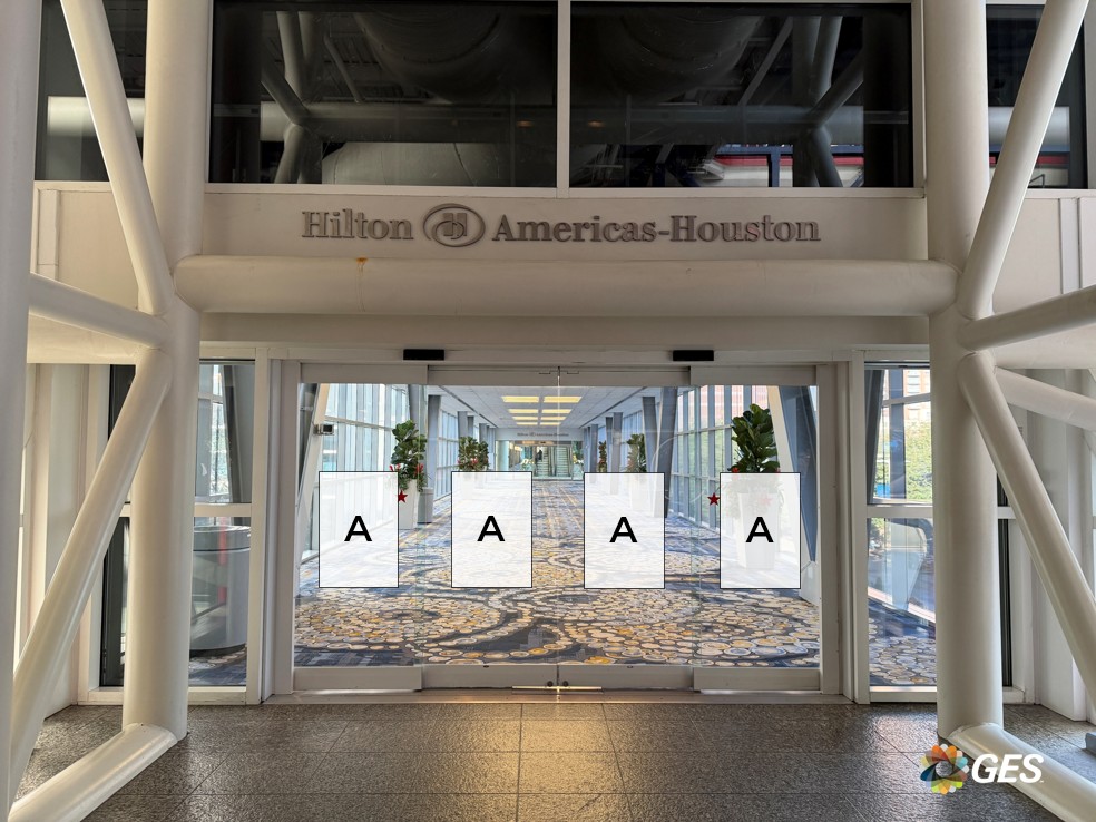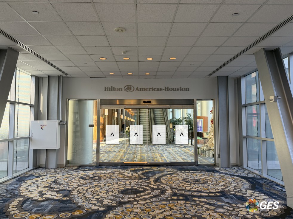 A = 24” wide x 36” high (qty 4, recommended size) Single sided graphic Perforated window cling Applied to windows and doors Located on level 2 on the entry doors to the Hilton America’s - Houston NOTE: Check with your facility event manager if this opportunity is available for your event. Outside sections do not move and measure 37.75” wide x 78.25” high. Middle sections slide to open and are 34.25” wide x 78.25” high.