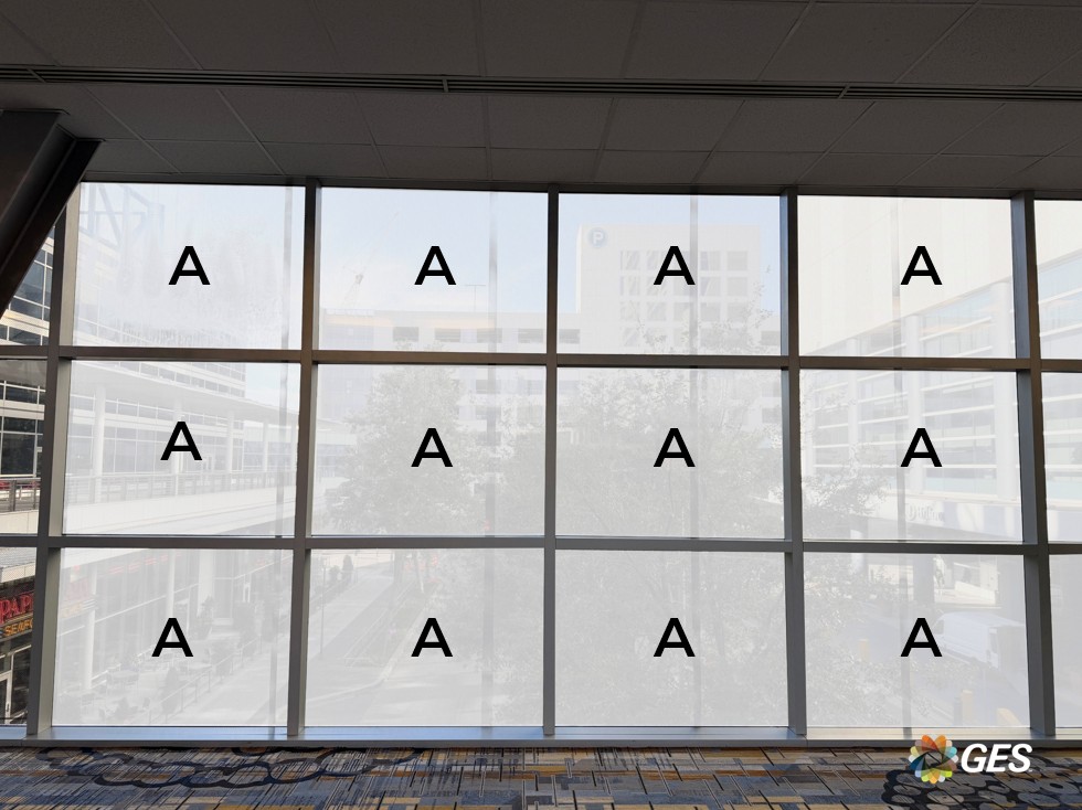 A = 87.75” wide x 73.25” high (qty 3) Single sided graphic Perforated window cling Applied to facility windows and doors Located on level at the entrance to the Lamar Balcony Add to cart