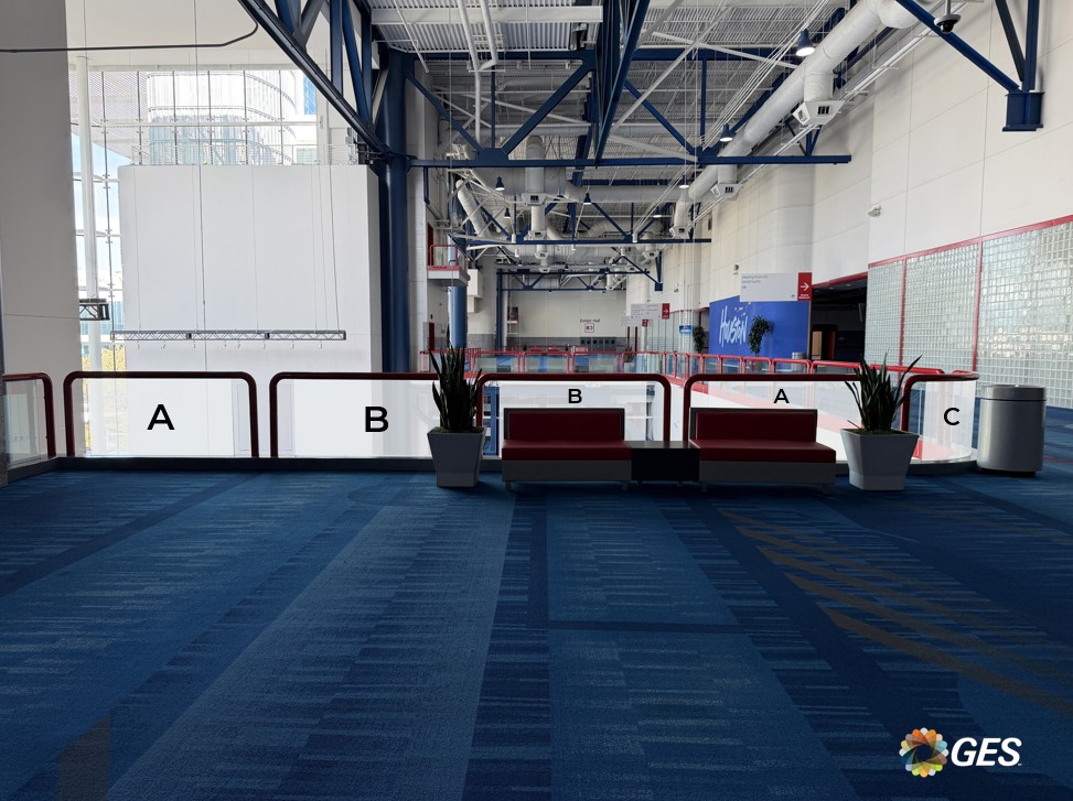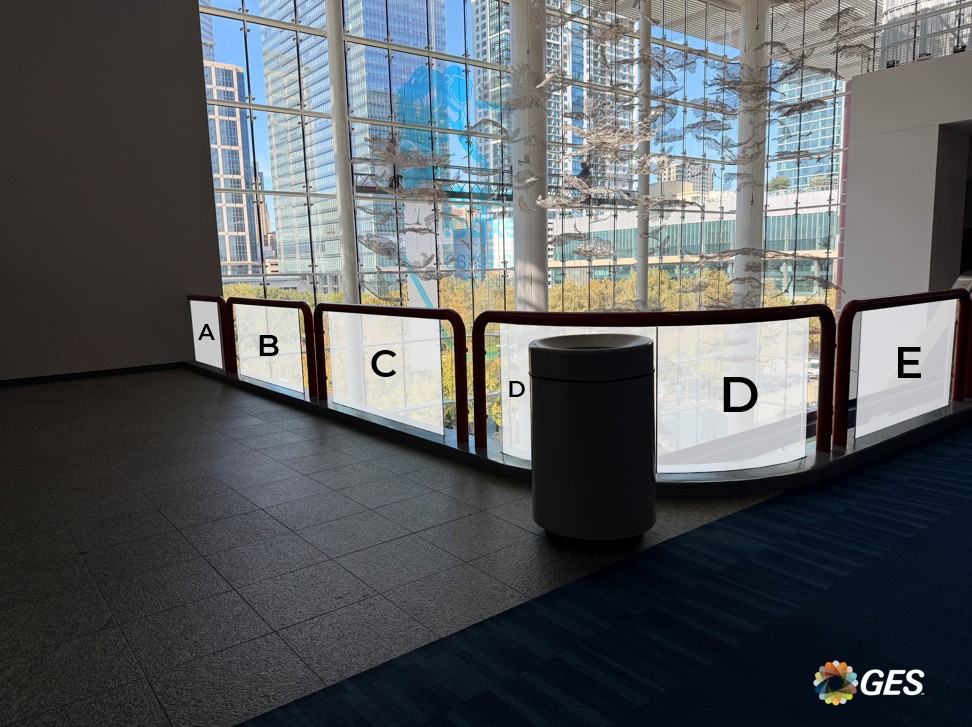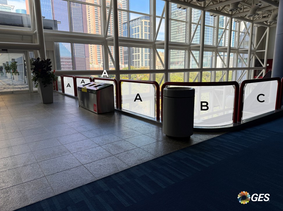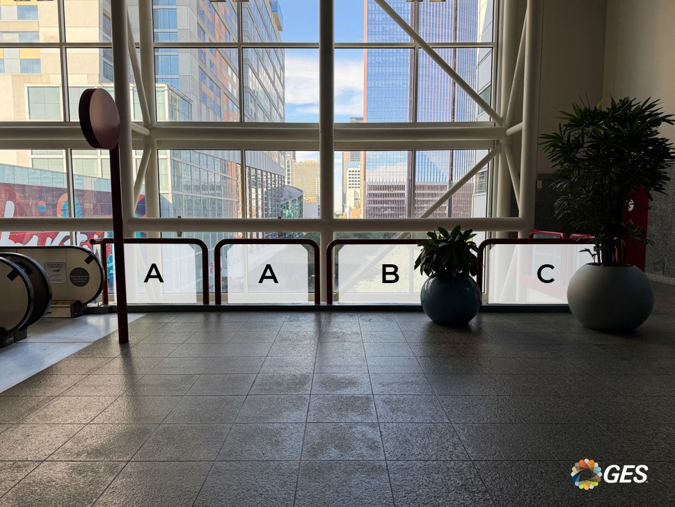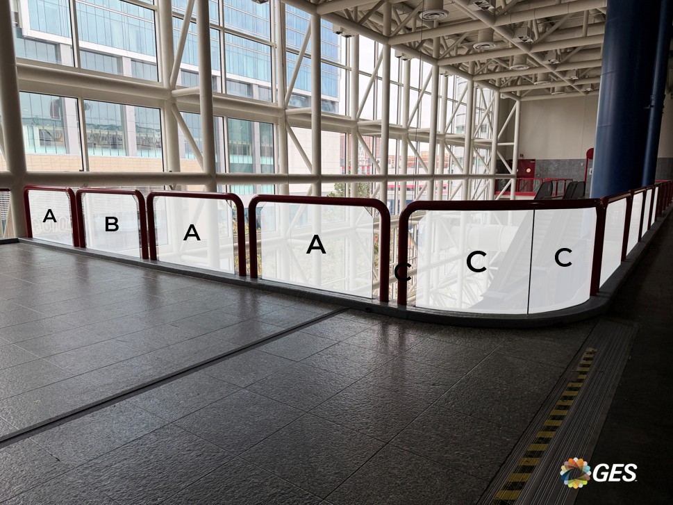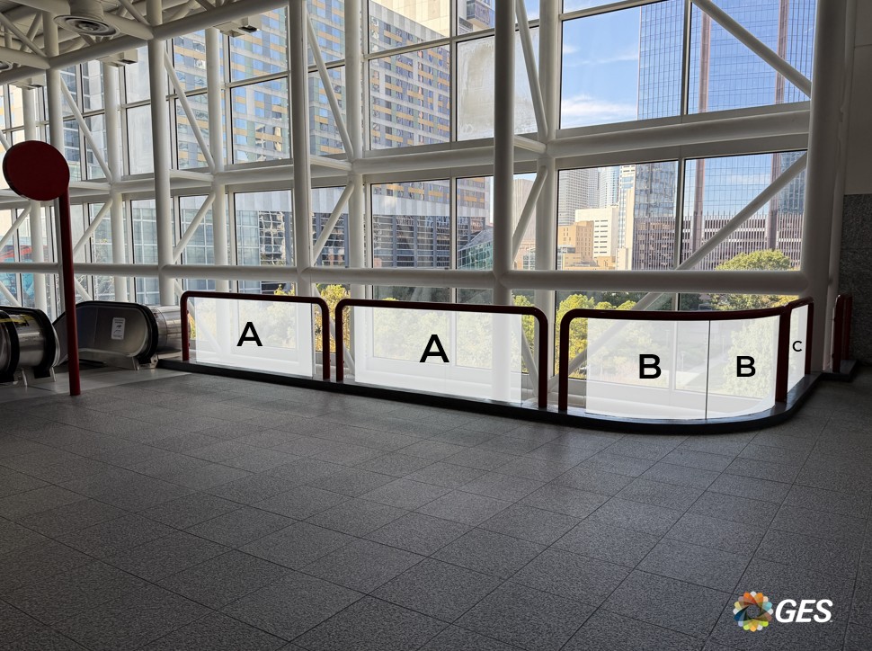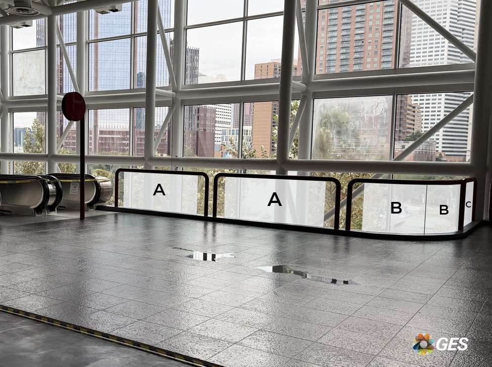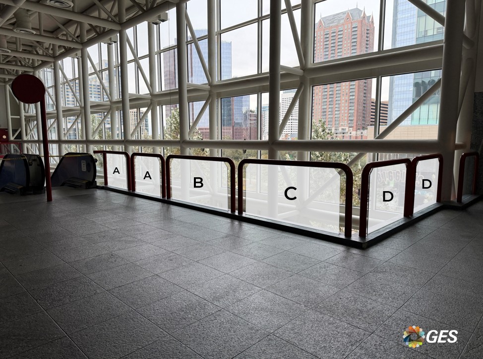 NOTE: top corners of glass are on an angle as shown and will be trimmed onsite during installation. Order of sections from left to right = A, A, B, C, D, D.